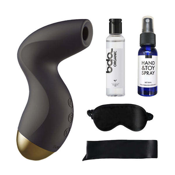 吸引バイブ、消毒スプレー、潤滑ローション、アイマスク&ハンドタイがついた、豪華でお得なギフトセット。