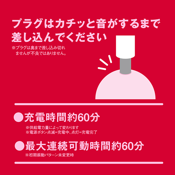 ※充電時間約60分(供給電力量によって変わります)最大連続稼働時間約60分(初期振動パターン未変更時)付属品:USBフォーンプラグ式充電ケーブル