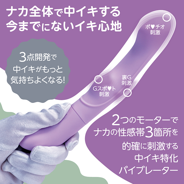 女性の中イキ性感帯のポル○オ・G・裏Gの3点に振動刺激をフォーカスした中イキ特化バイブです。