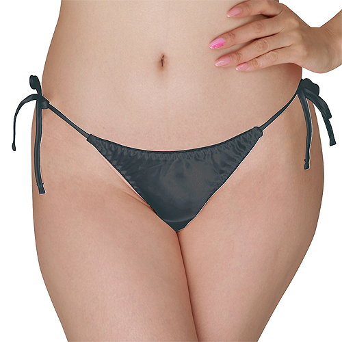 ブラックカラーの妖艶な光沢感でセクシーさを魅惑的に演出する、紐パンタイプの女性用Tバックショーツ。両サイドを紐で結ぶ、いわゆる紐パン仕様なので、結び目を引っ張るだけで簡単に脱がすことができちゃう危うさが、妙にエロさを感じさせます。