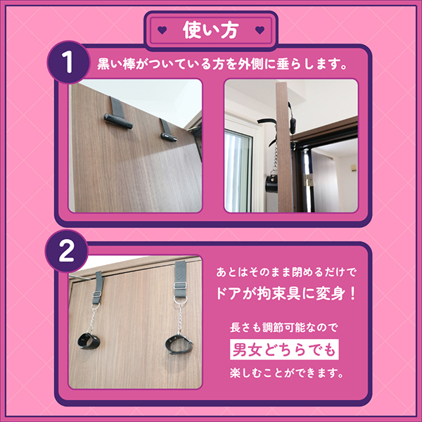 ●開き戸の上部に挟み、手枷を垂らすだけでドアが拘束具に。