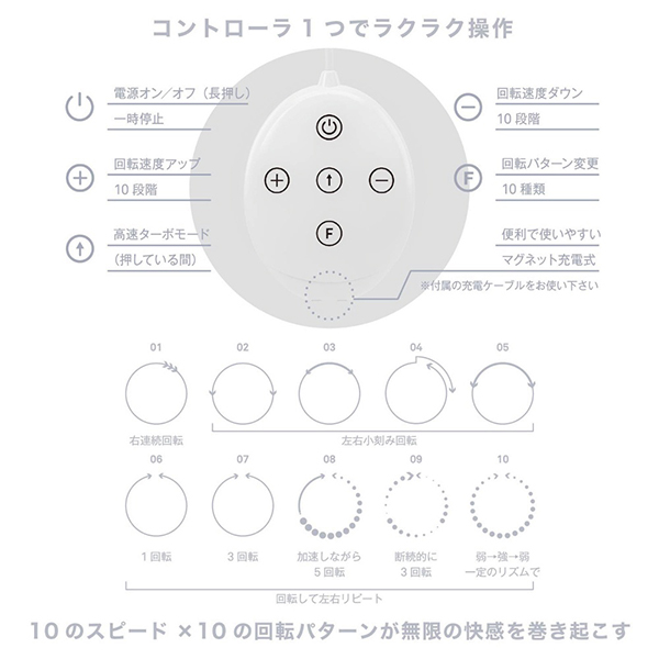 リチウム電池搭載の軽量コントローラは、10段階パワー調節×10種類の回転パターン。