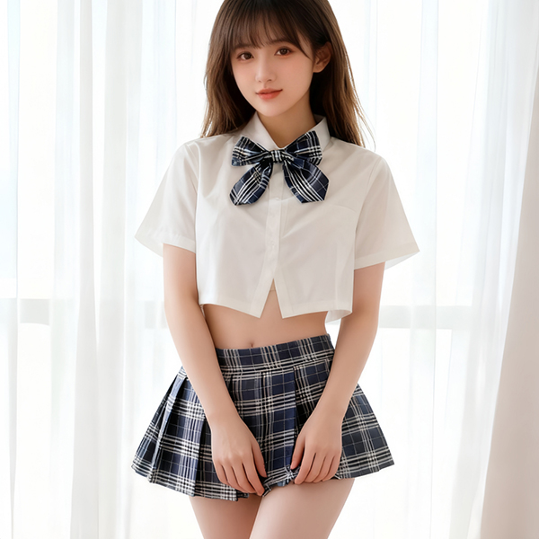 白のショートトップスはクラシックな制服の雰囲気を保ちつつ、おへそとウエストを自然に見せてさりげなく誘惑アピール。