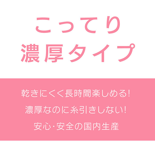 こってり濃厚タイプは、乾きにくく長時間楽しめます。また、濃厚なのに糸引きしにくく、注ぎやすいノズルキャップ仕様。