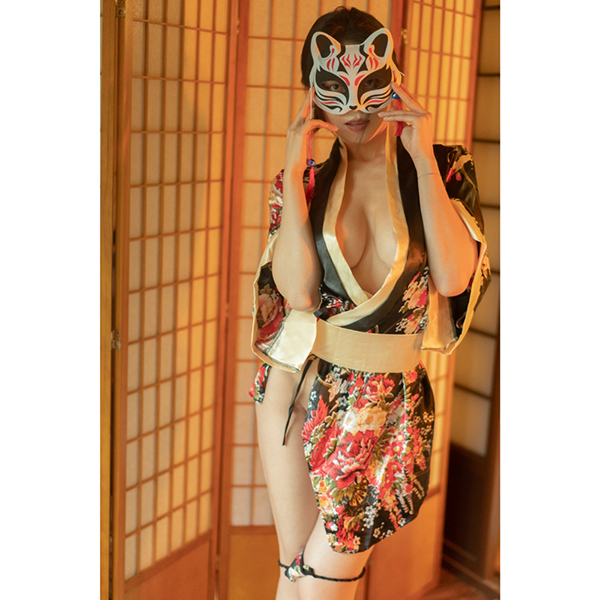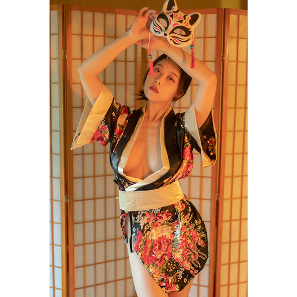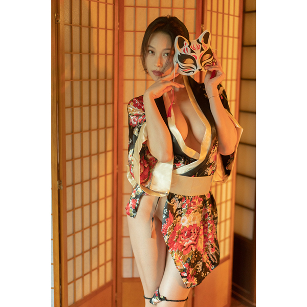 豪華な黒地サテンに赤・金・ピンクの華やかな花柄が咲き乱れるミニ着物風デザイン、さらに付属のTバックも同柄!大胆にはだけた胸元、裾から見え隠れする美脚&美尻などなど、雅な花魁をイメージしたまさに至高のアイテム。